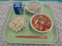 ミルクパン、牛乳、太平燕(タイピーエン)、焼きぎょうざ、もやしのナムル です。