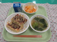 お好み焼き、牛乳、中華スープつくね、フルーツ和え です。