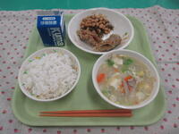 麦ご飯、牛乳、牛肉の当座煮、すまし汁、納豆、一食焼きのり です。