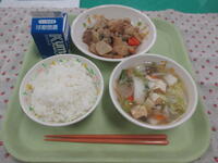 今日の献立は、麦ご飯、牛乳、照焼チキン、ミネストローネ、ポテトサラダでした。
