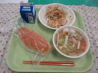 ミルクパン、牛乳、太平燕(タイピーエン)、焼きぎょうざ、もやしのナムル です。