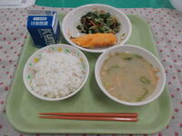 麦ご飯、牛乳、魚のもみじ焼き、みそ汁、酢の物 です。
