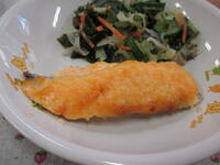 ユネスコ無形文化遺産にも選ばれている「和食:日本人の伝統的な食文化」です。本日の「魚のもみじ焼き」は、すりおろした「人参(にんじん)」の赤色を「紅葉(もみじ)」の色に見立てています。和食にはこのように「日本の四季」を食で表現する物も多く、「目でも食べる」とも言われますね。季節感満載の給食です。