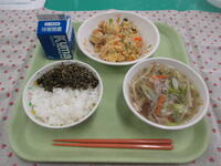 ご飯、牛乳、高野豆腐の卵とじ、沢煮椀、手作りふりかけ です。