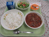 今日の献立は、ハヤシライス、牛乳、コーンサラダでした。