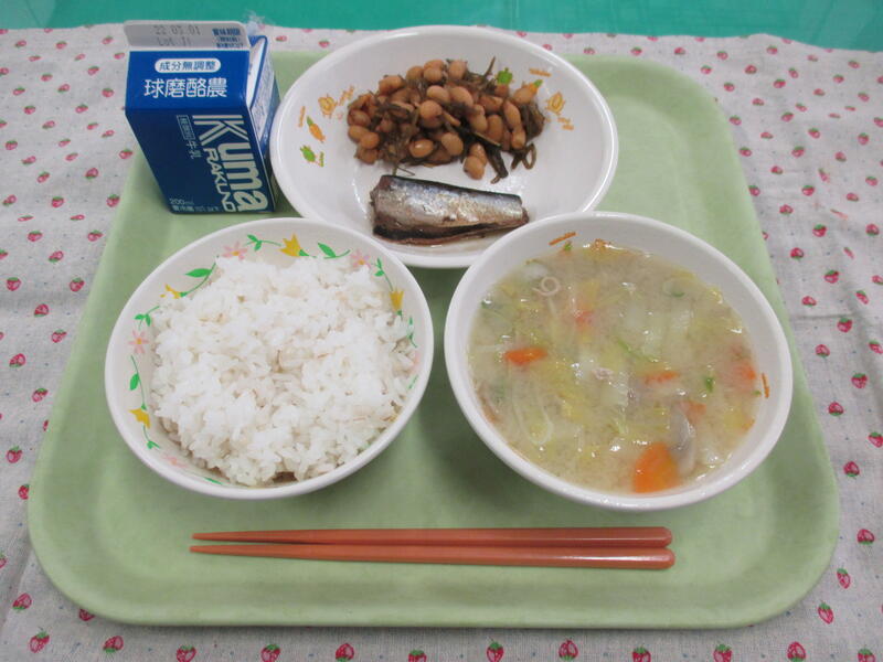 麦ご飯、牛乳、いわしの生姜煮、さつま汁、座禅豆(ざぜんまめ) です。