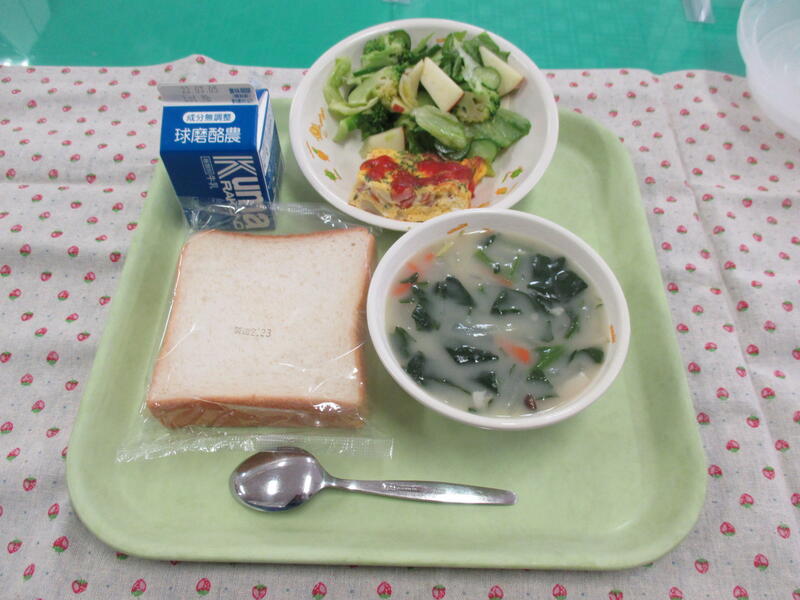 食パン、牛乳、スパニッシュオムレツ、クリームスープ、菜果サラダ です。