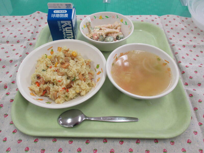 カレーピラフ、牛乳、野菜スープ、ツナマカロニサラダ です。