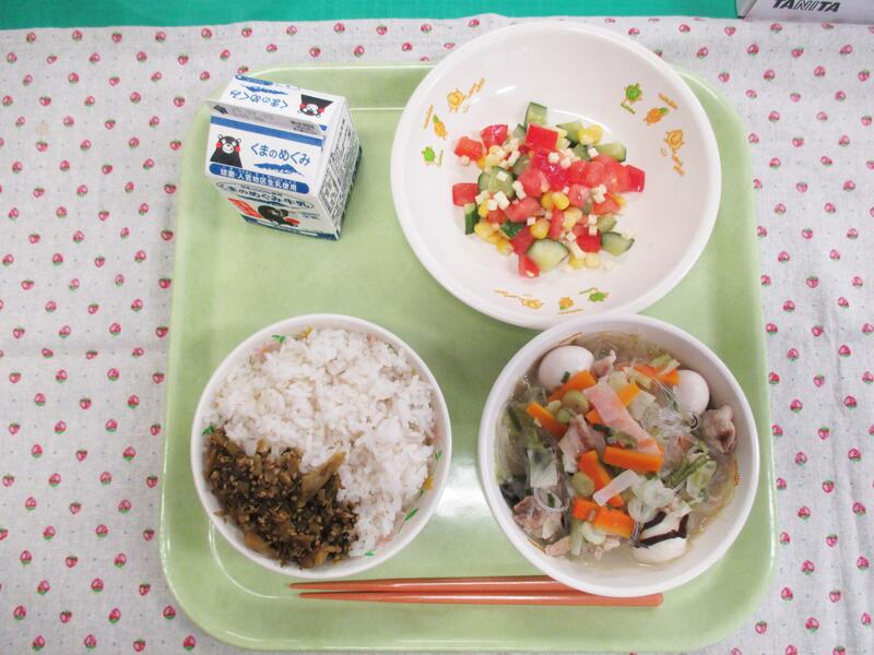 今日の献立は、親子丼、牛乳、ビーフンサラダ、黒糖大豆でした。