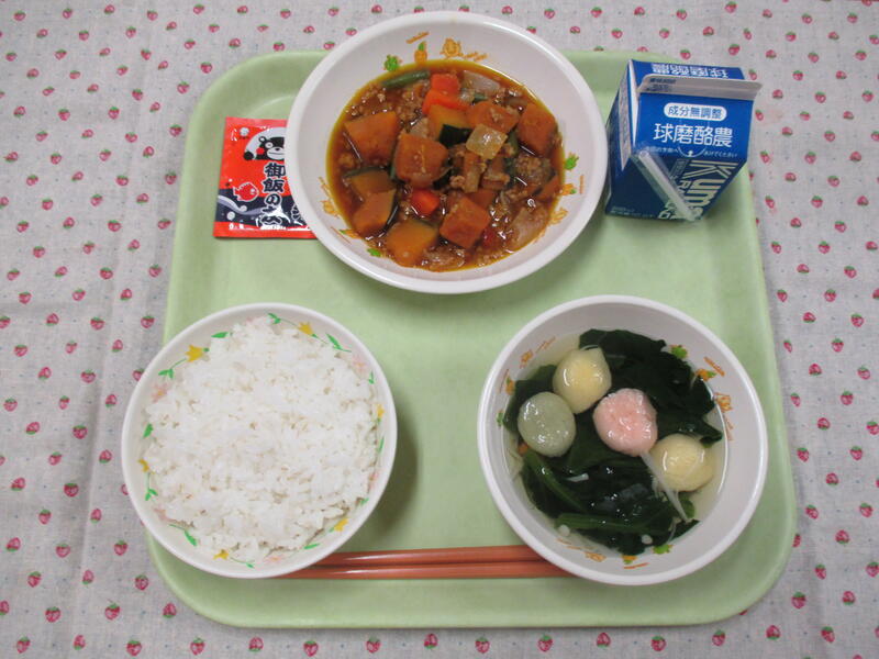 今日の献立は、麦ごはん、牛乳、かぼちゃのそぼろ煮、つみれ汁、ふりかけでした。
