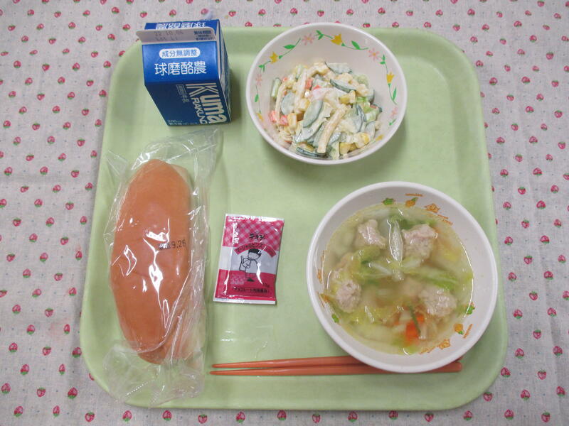 今日の献立は、コッペパン、牛乳、肉団子スープ、マカロニサラダ、マーシャルビーンズでした。