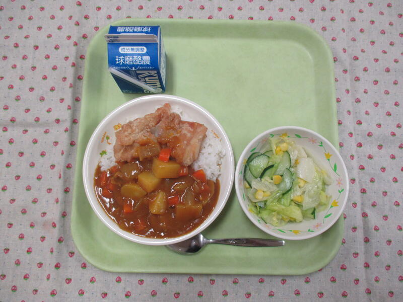 今日の献立は、からあげカレー、牛乳、グリーンサラダでした。