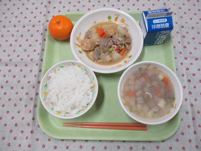 今日の献立は、麦ごはん、牛乳、大根と豚肉のみそ煮、つぼん汁、みかんでした。