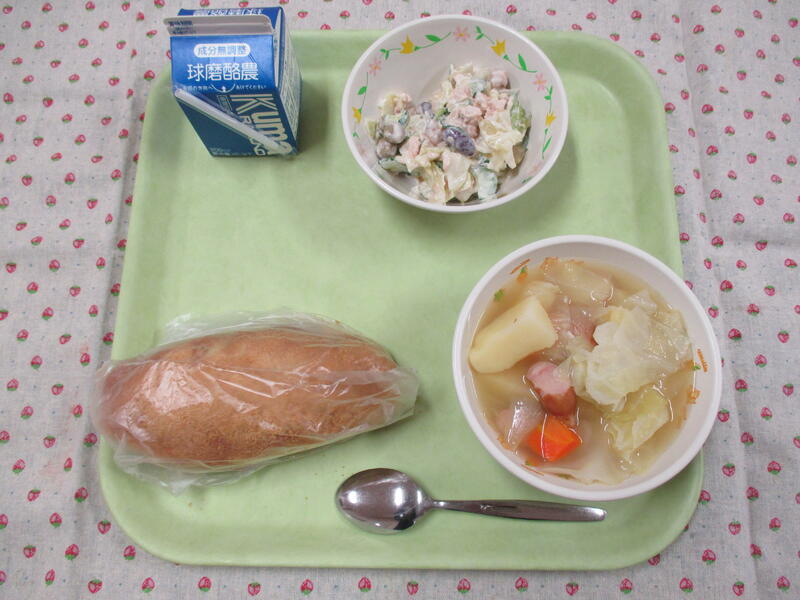 今日の献立は、きなこ揚げパン、牛乳、ポトフ、ビーズンサラダでした。