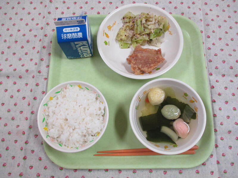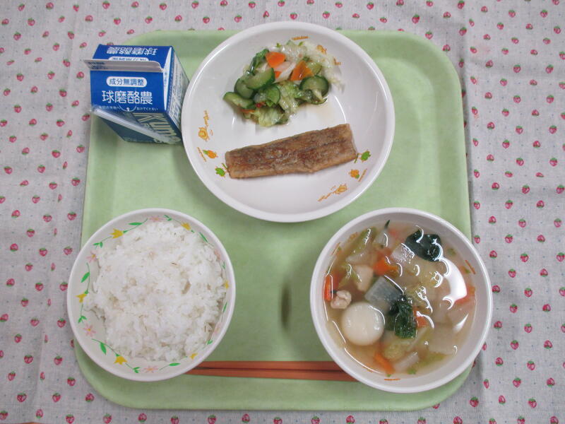 今日の献立は、麦ごはん、牛乳、鶏肉のかぼすづけ、お野菜のつみれ汁、キャベツのゆかりあえでした。