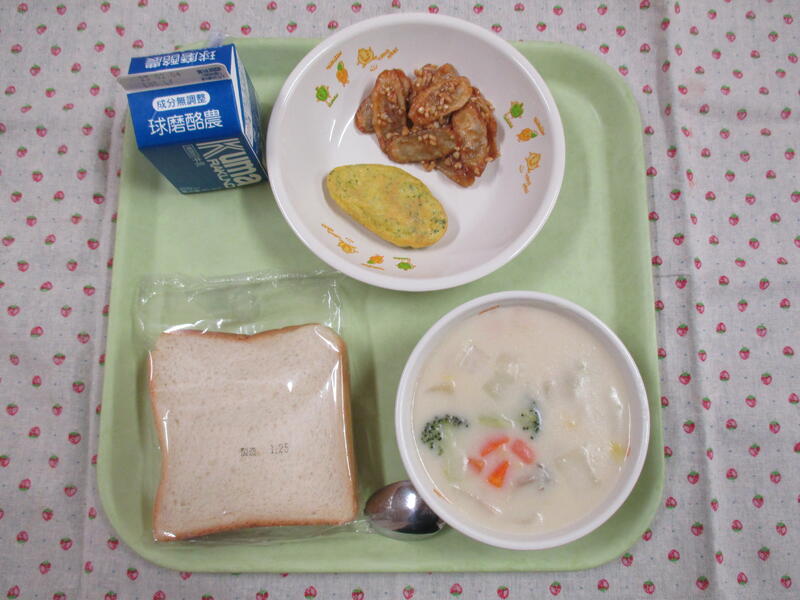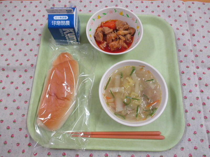 今日の献立は、ミルクパン、牛乳、白菜スープ、鶏肉のトマトソース煮でした。