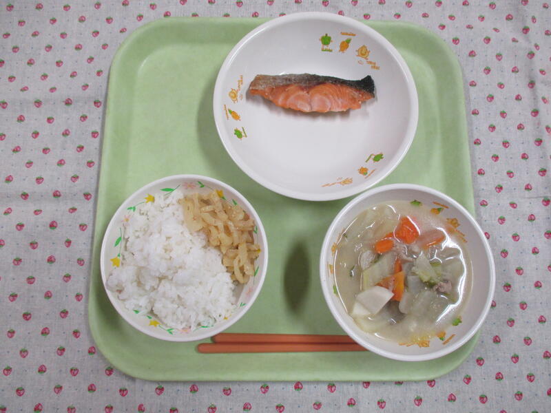 今日の献立は、麦ごはん、牛乳、鮭の塩焼き、豚汁、たくあんのごま炒めでした。