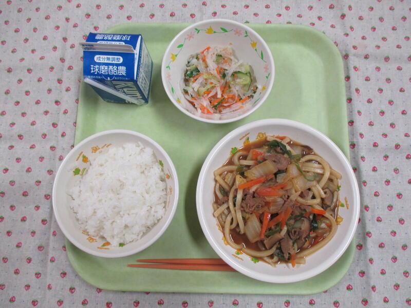 今日の献立は、麦ごはん、牛乳、すきやきうどん、三色なますでした。