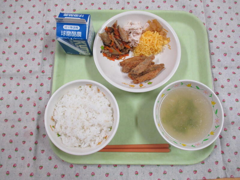 今日の献立は、麦ごはん、牛乳、鶏飯の具、鶏飯の汁、小いわしの梅の香揚げでした。