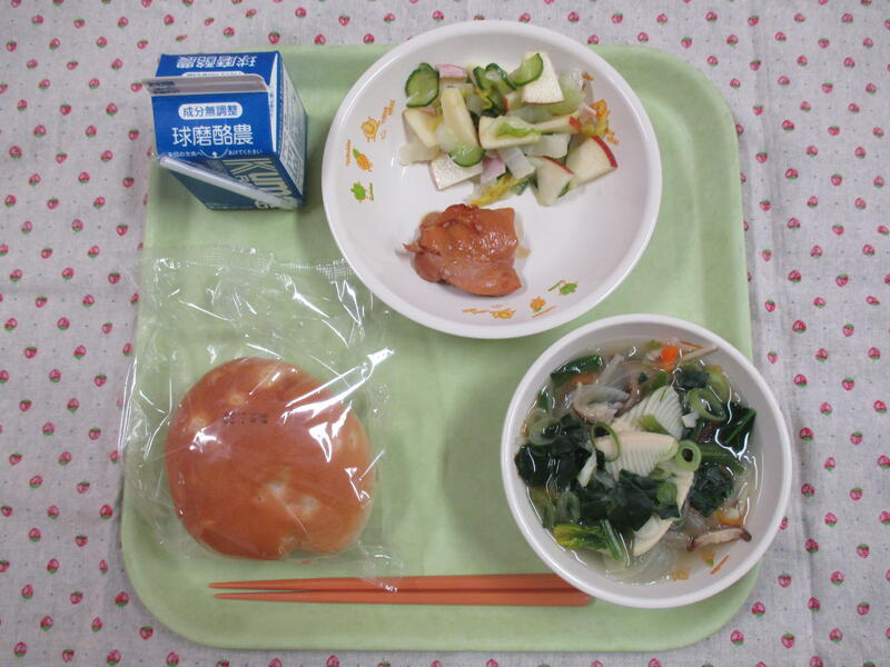 今日の献立は、パインパン、牛乳、鶏の照り焼き、春雨スープ、白菜とリンゴのサラダでした。