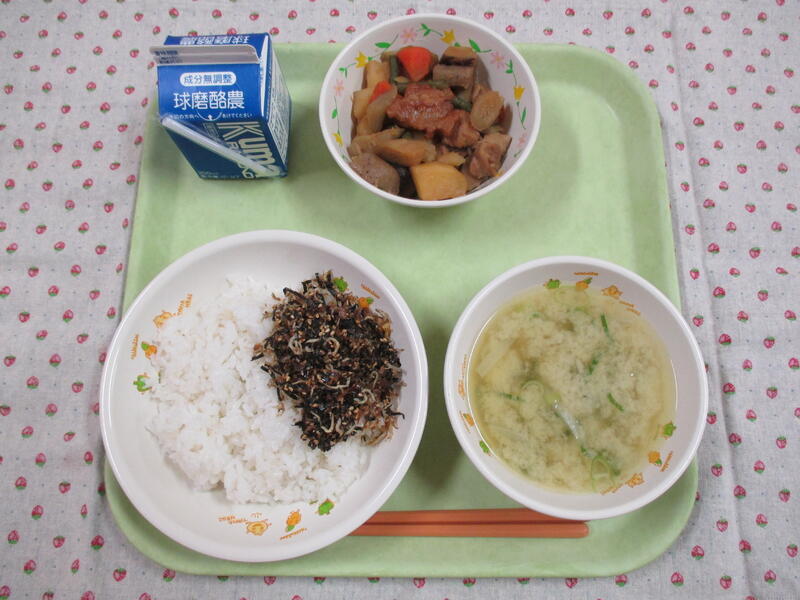 今日の献立は、ひじきごはん、牛乳、いわしの梅煮、鶏汁でした。