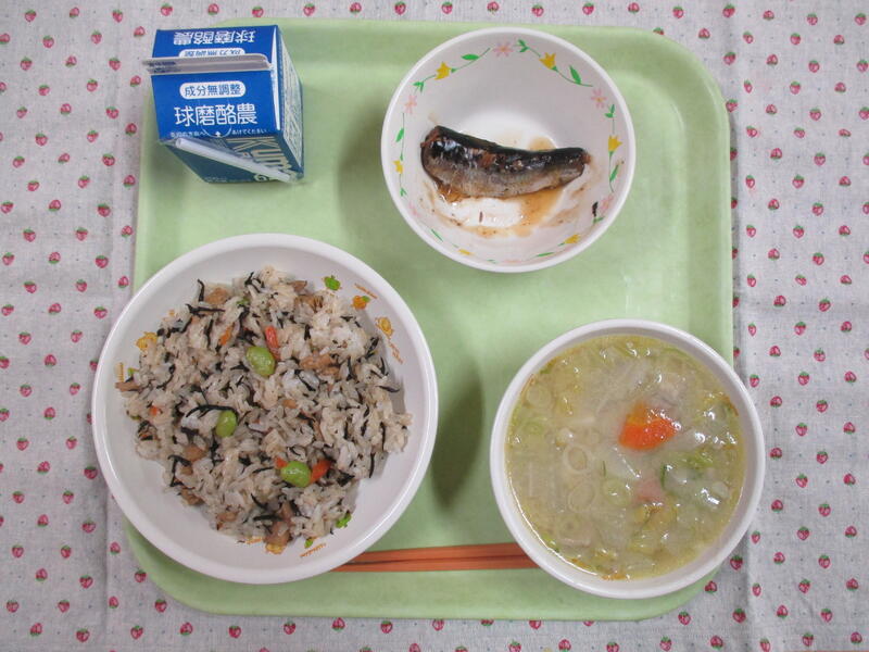 今日の献立は、ひじきごはん、牛乳、いわしの梅煮、鶏汁でした。