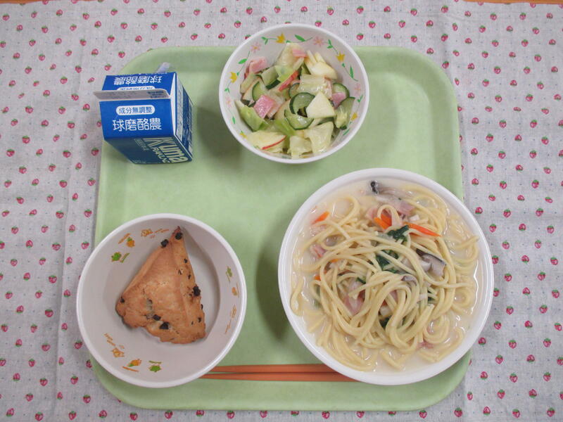 今日の献立は、チョコチップスコーン、牛乳、ほうれん草ときのこのスパゲッティ、フレンチサラダでした。