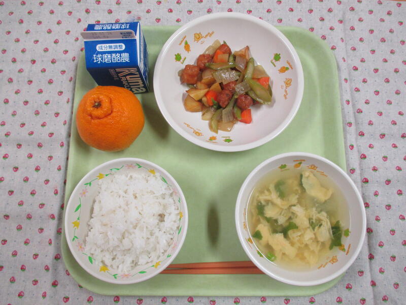 今日の献立は、麦ごはん、牛乳、アスパラガスとつくねの揚げがらめ、菜の花汁、不知火(果物)でした。