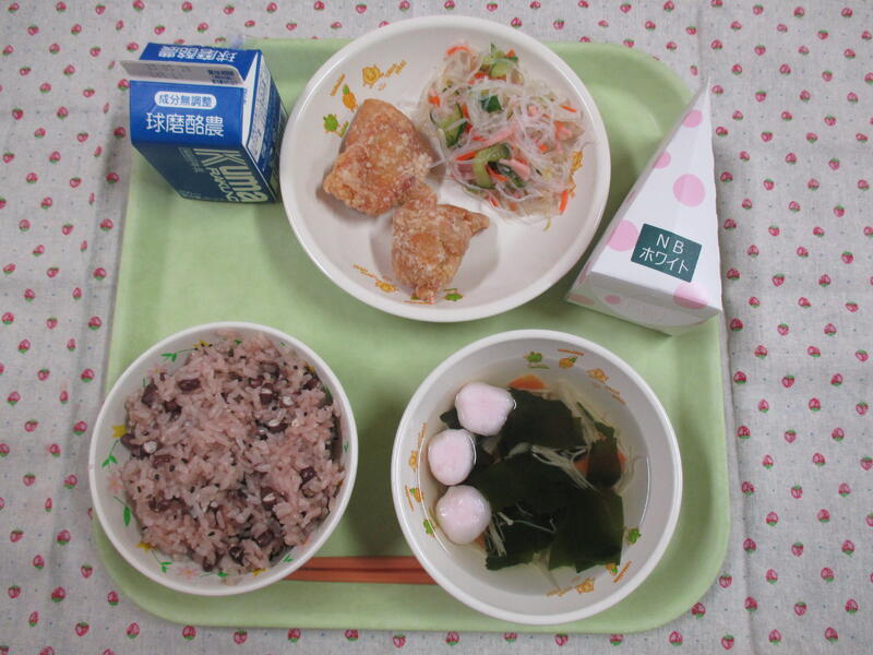 今日の献立は、赤飯、牛乳、鶏の唐揚げ、すまし汁、五色和え、お祝いデザート(ケーキ)でした。