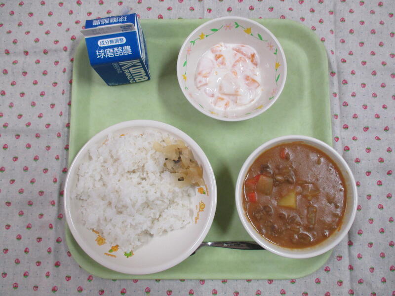 今日の献立は、ビーフカレー、牛乳、ヨーグルト和え、福神漬けでした。