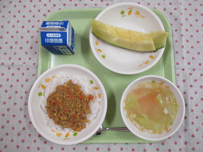 今日の献立は、麦ごはん、牛乳、ドライカレー、野菜スープ、メロン、ジューシーでした。