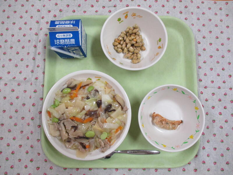今日の献立は、中華丼、牛乳、焼ぎょうざ、粉茶の大豆かりんとうでした。