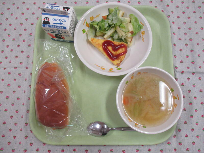 今日の献立は、ミルクパン、牛乳、アンサンブルエッグ、マカロニスープ、菜果サラダでした・