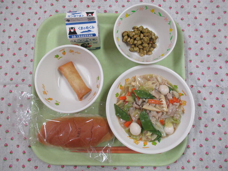 今日の献立は、ミルクパン、牛乳、春巻き、八宝菜、粉茶の大豆かりんとうでした。