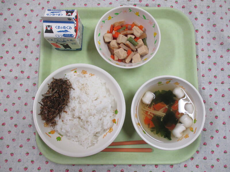 今日の献立は、麦ごはん、牛乳、高野豆腐の炊き合わせ、すまし汁、手作り佃煮でした。