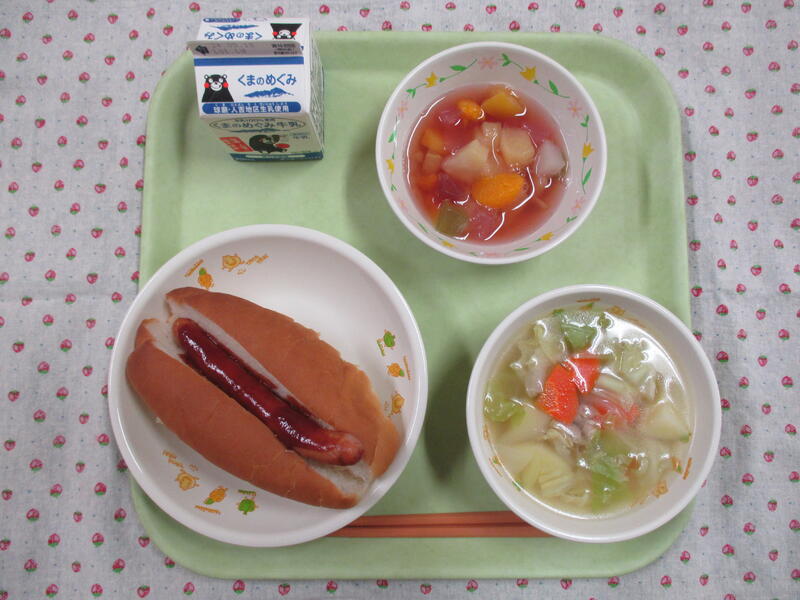 今日の献立は、セルフドッグ、牛乳、ポテトのスープ、フルーツのサングリアでした。