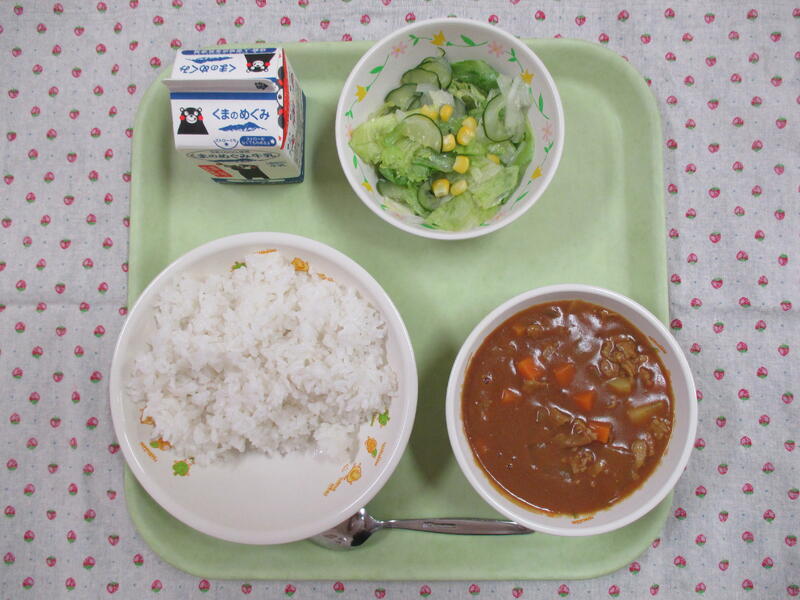 今日の献立は、ポークカレー、牛乳、サラ玉サラダでした。