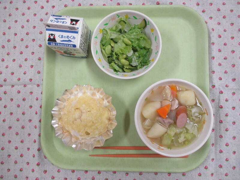今日の献立は、チーズ蒸しパン、牛乳、春のポトフ、グリーンサラダでした。