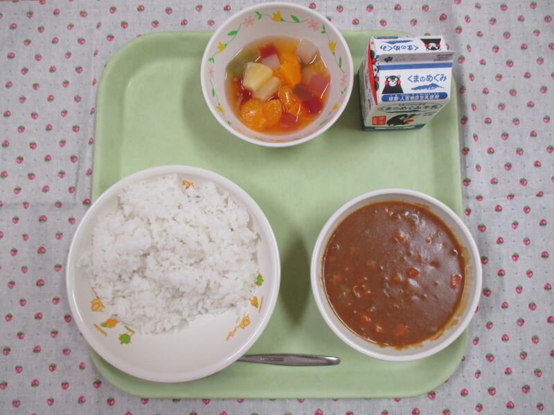 今日の献立は、麦ごはん、チキンカレー、フルーツカクテル、牛乳でした。