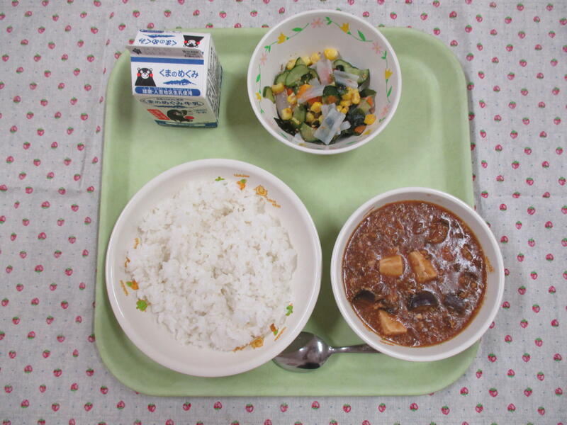 今日の献立は、麦ごはん、牛乳、マーボーなす、こんにゃくサラダでした。