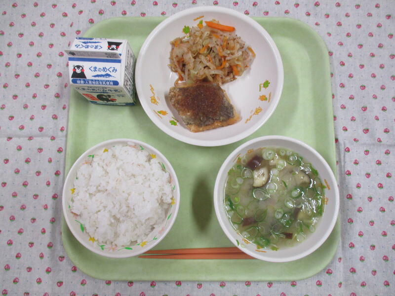 今日の献立は、麦ごはん、牛乳、魚のしょうがたれ、みそ汁、ごま和えでした。
