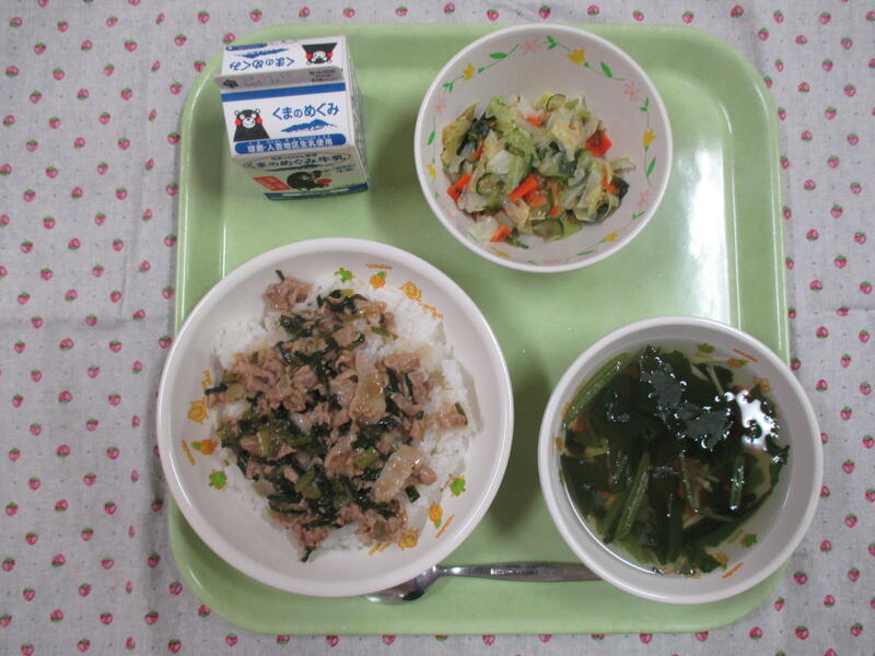 今日の献立は、豚にら丼、牛乳、甘酢あえ、すまし汁でした。
