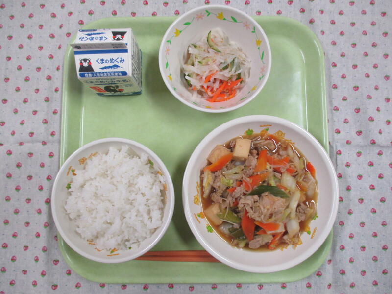 今日の献立は、麦ごはん、牛乳、肉豆腐、三色なますでした。