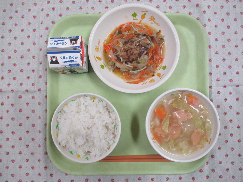 今日の献立は、麦ごはん、牛乳、ハンバーグの野菜あんかけ、トマト団子のスープでした。