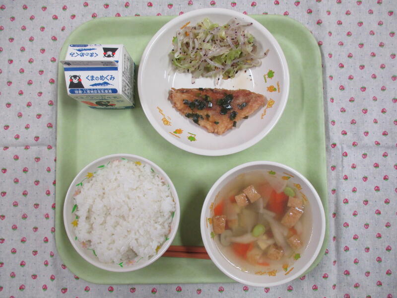 今月のふるさとくまさんデーでは、八代産のニラを使った魚のニラだれと上益城地方の郷土料理のいちょう葉汁でした。いちょう葉汁は、いちょう切りした大根や人参をいちょうの葉に、大豆や枝豆を銀杏に見立てた汁物です。それから、先日いただいた棚田米の新米が登場しました。熊本の味をかみしめながら、今日もおいしくいただきました。
