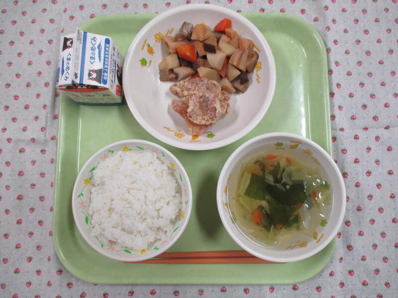 今日の献立は、ごはん、牛乳、鶏の唐揚げ、すまし汁、煮しめでした。