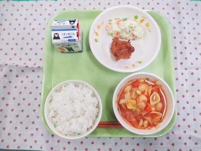 今日の献立は、麦ご飯、牛乳、照焼チキン、ミネストローネ、ポテトサラダでした。