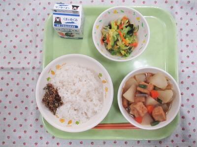 今日の献立は、麦ご飯、牛乳、大根のうま煮、酢みそ和え、手作り佃煮でした。