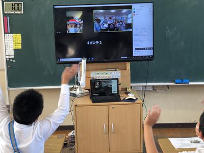 修学旅行に行っている6年生と、いつも複式学級でいっしょに勉強している5年生が、zoomを使って交流しました。教室にいた5年生は、短い間でしたが、修学旅行先の6年生を見て、大喜びでした。来年度自分たちの姿を想像していたようです。