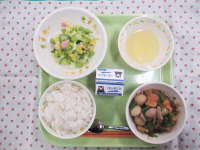 今日の献立は、麦ご飯、牛乳、鶏の照り焼き、のっぺ汁、あずき白玉でした。